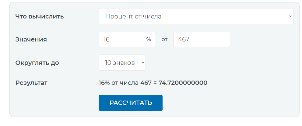 Инструмент избавит вас от нудных подсчетов, вероятных ошибок и путаницы в формулах. Кстати, выбираете, как округлять значение, вы самостоятельно. Можно получить как целое число, так и максимально точное значение до десяти знаков после запятой.
