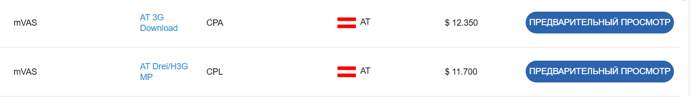 Охват партнерки – почти весь мир. И, что радует, есть эксклюзивные ГЕО и офферы с высокими ставками, которых вы больше нигде не найдете. К примеру, как вам рейты этих mVAS-офферов под Австрию?