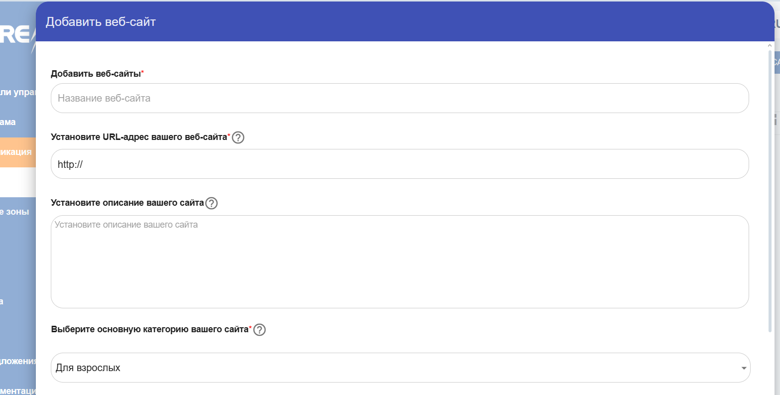 - Добавить в систему свой сайт – ввести название, URL, описание, выбрать категорию из списка. Есть премодерация – проверка ресурсов. Если все в порядке, вам апрувнут кампанию;