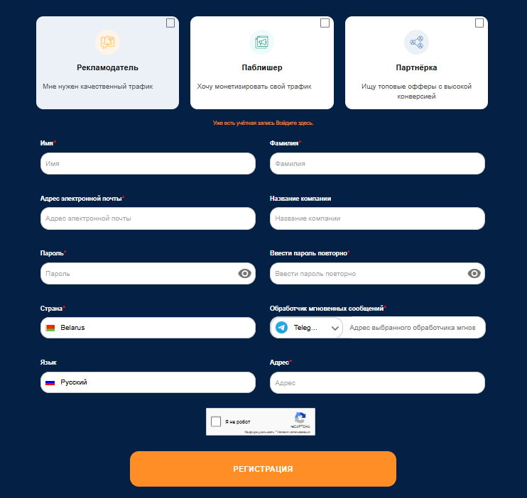 Чтобы зарегистрироваться в Reacheffect, не нужно создавать дополнительные учетки веба, рекламодателя или партнера. Для реги просто перейдите по ссылке и заполните форму. В ней нужно указать, кто вы – рекламодатель, веб или паблишер. Затем – ввести свое имя, e-mail, пароль и мессенджер для связи. Все контакты должны быть актуальными, чтобы поддерживать общение с саппортом.