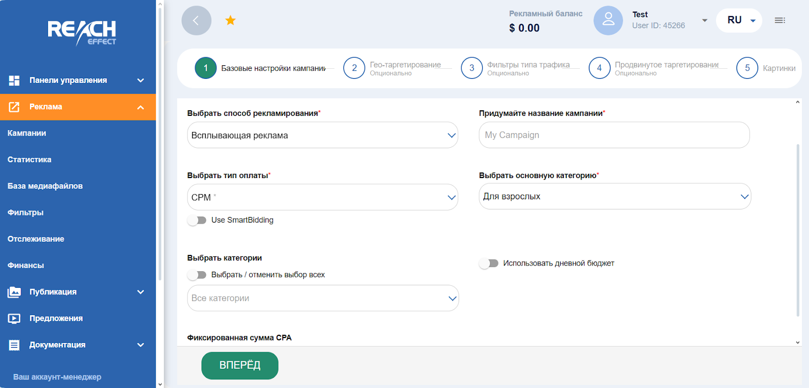 В ReachEffect представлены все топовые форматы для рекламных кампаний – пуши, всплывающая реклама, переадресация, видео и нативка. Но, конечно, выбором видов рекламы возможности платформы не ограничиваются. Здесь вы найдете: