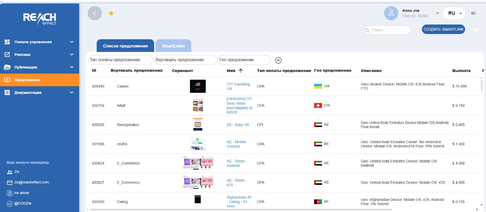А теперь – о CPA-сети ReachEffect. Здесь также есть «умная» фишка – Smartlink. Благодаря ней ЦА будет видеть рекламу офферов, наиболее подходящих ей по таргетингу и интересам. Залив на смартлинку подойдет новичку, который пока не поднаторел в тестировании офферов. Но и опытному вебу она пригодится.