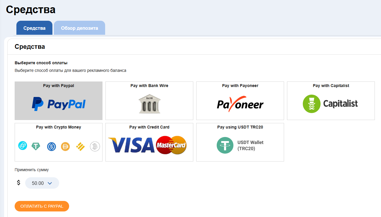 Пополнение счета здесь довольно удобное. Доступна целая пачка способов – крипта (BTC, USDT TRC-20 и другие валюты), банковская карта или перевод, PayPal, Payoneer, Capitalist. Минималка стандартная для рекламных сетей – $100. Радует и то, что во вкладке «Обзор депозита» можно отслеживать историю пополнений.