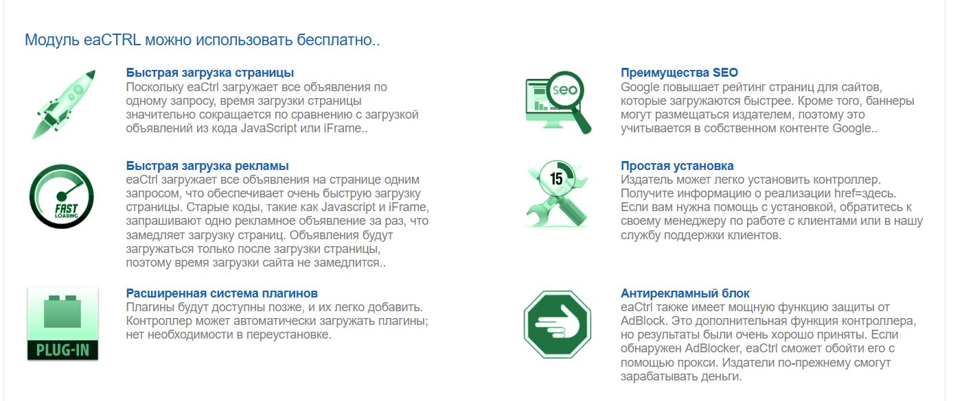 Возможности монетизации сайтов | Благодаря модулю eaCTRL профит можно увеличить в несколько раз. | Стандартные встроенные коды рекламы. |