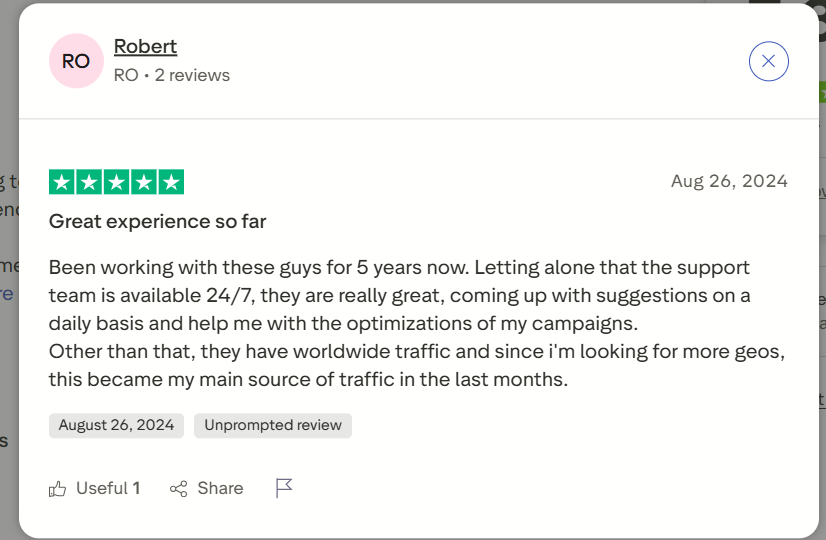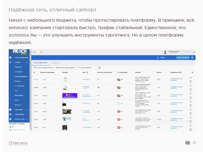 В другом отзыве отмечается стабильность объемов трафика, и в целом вебу нравится все. Саппорт он хвалит тоже, как и надежность платформы. И, кстати, сообщений о ботном трафике я не нашла – как ни пыталась. А это уже хороший признак. Обычно рекламодатели и вебы не молчат о таком.