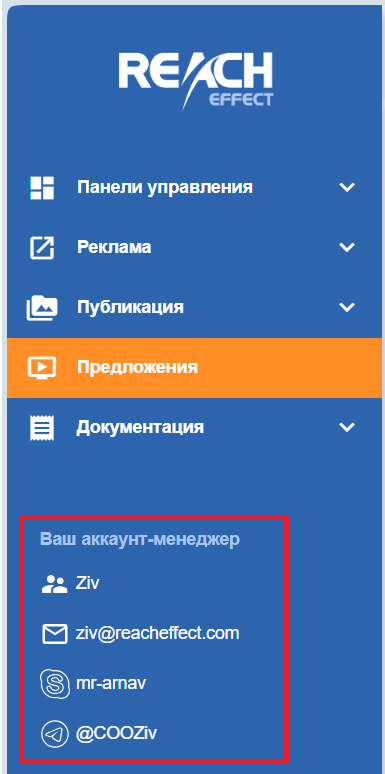 У каждого пользователя в ReachEffect есть свой персональный менеджер. К нему можно обращаться с любыми вопросами. Контакты указаны прямо в личном кабинете. Кроме того, есть почта саппорта, куда также принимают ваши обращения.