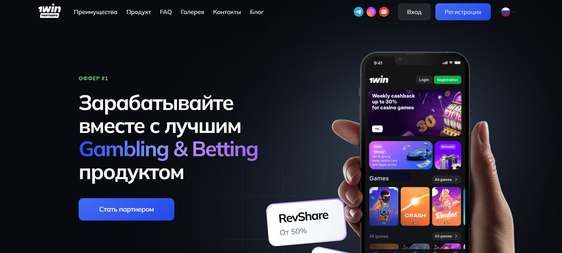 Это партнерская программа от прямого рекламодателя – онлайн-казино и БК 1Win. Начала работу в 2017 году. Из ГЕО доступны страны СНГ, Индия, Западная Африка. Но геоохват планируется расширить на Европу и ЛатАм. Вебам предлагают сотрудничество по трем моделям: