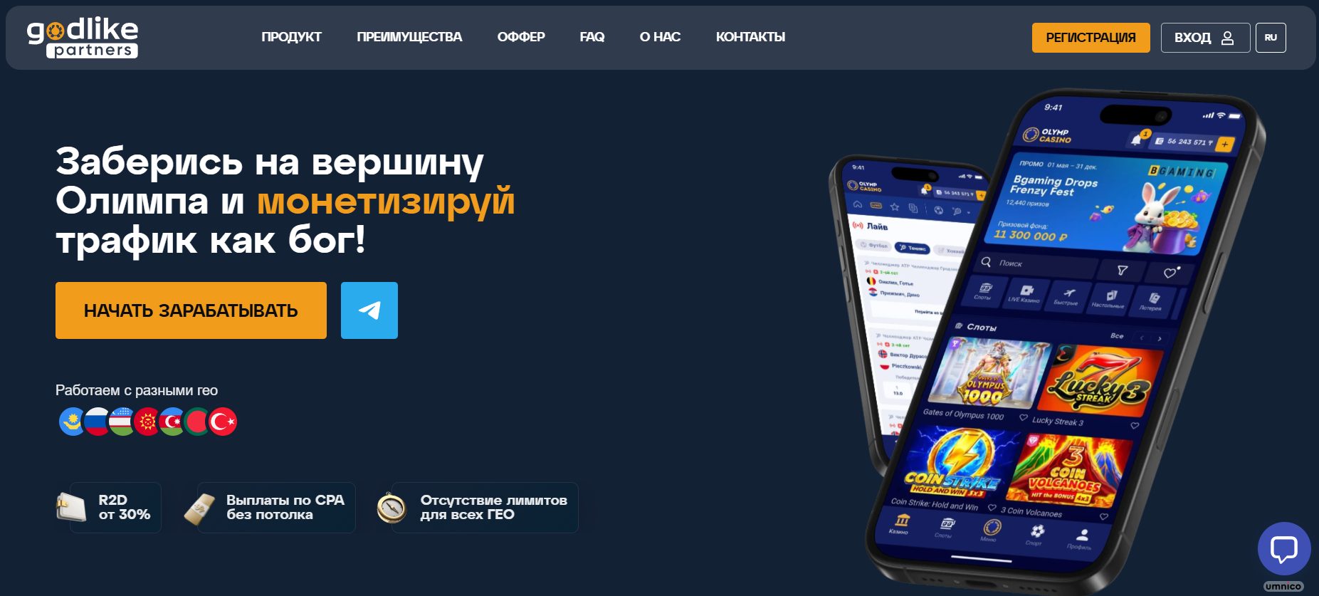Godlike Partners – партнерская программа и прямой рекламодатель iGaming-продукта Olymp Casino, за которым стоит команда с более чем 20-летним опытом в индустрии.