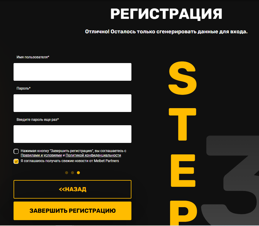 Регистрация в MelBet Partners устроена в несколько этапов, но сам процесс простой. Сначала надо представиться системе, указать почту, мессенджер для связи. Затем – тип и ГЕО трафика, ваш источник, реквизиты для вывода будущего заработка. И на последнем этапе – имя пользователя и пароль.