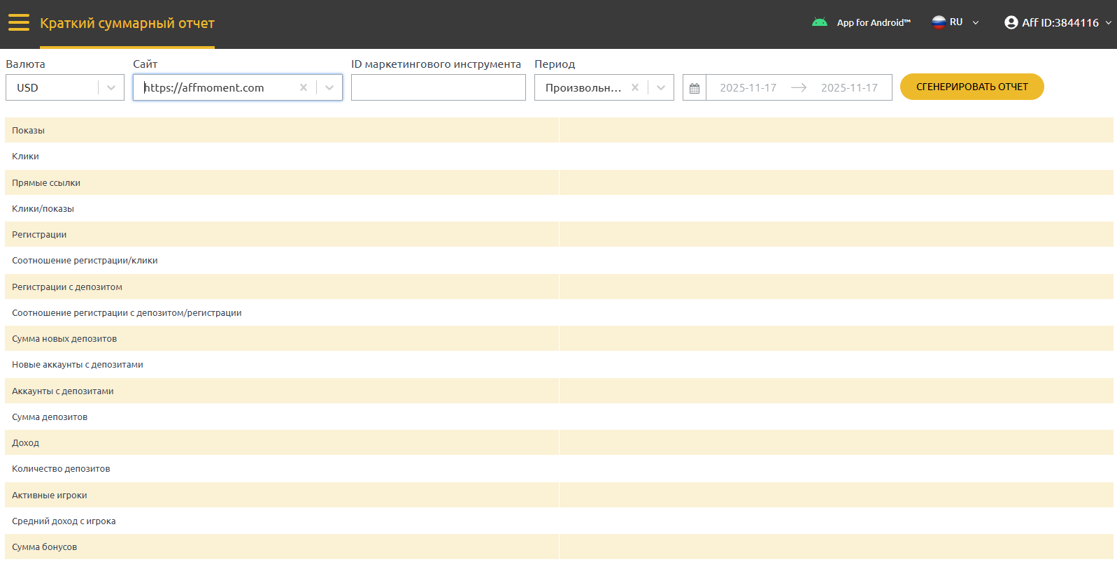 Сразу хочется отметить, что партнерка – прямая от бренда. Поэтому все данные передаются в стату оперативно. Вы сможете мониторить отчеты с минимальной задержкой. А статистика здесь более, чем подробная: есть краткий сводный и общий подробный отчет, отчеты по игрокам, промо и т. д. Они экспортируются в Excel или CSV по выбору.