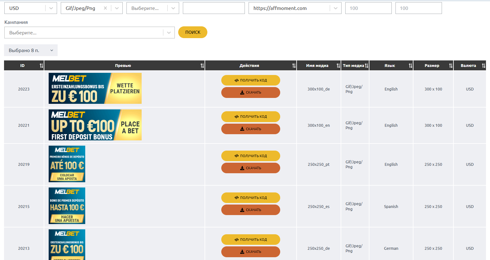 Гемблинг и беттинг партнерки обычно не отличаются большим выбором промо. Но MelBet не входит в список таких скупых ПП. Здесь – просто гигантский каталог готовых баннеров. Они сделаны на разных языках, различных форматов и размеров.