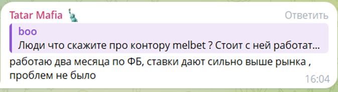 Из-за путаницы с клонами партнерских программ легко запутаться и в мнениях аффов. Но что касается MelBet Partners, отзывы она получает стабильно хорошие. Например, вот такой отклик: