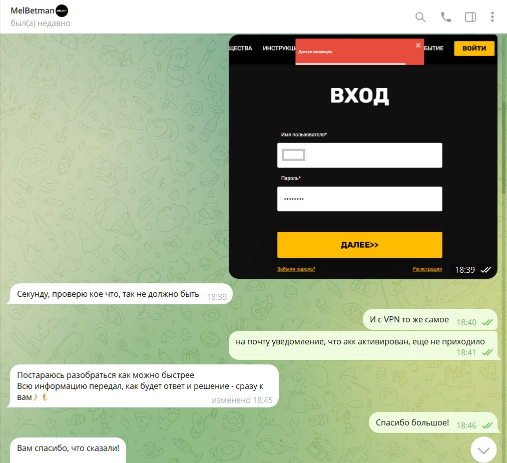 Например, когда я писала этот обзор, случился казус. Я забыла пароль от прежней учетки и попыталась создать новую. Естественно, антифрод меня забанил напрочь (работает он четко, мультиакки ведь запрещены). Пришлось написать менеджеру. Наш диалог – на скрине: