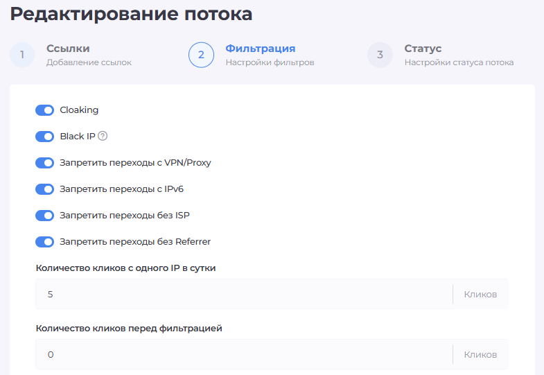 Статус потока означает то, находится ли ваша клоака на паузе или активна. Если поток стоит на паузе, все по умолчанию будут направляться на white page. Если активна – будут работать фильтры и ссылки, которые вы только что задали.