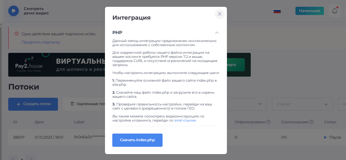 Чтоб выбрать интеграцию, в меню потоков кликните напротив нужного значок загрузки. Если вы указали PHP, то скачайте архив с файлом index.php. Файл нужно извлечь и отнести в корневую папку архива на хостинге.