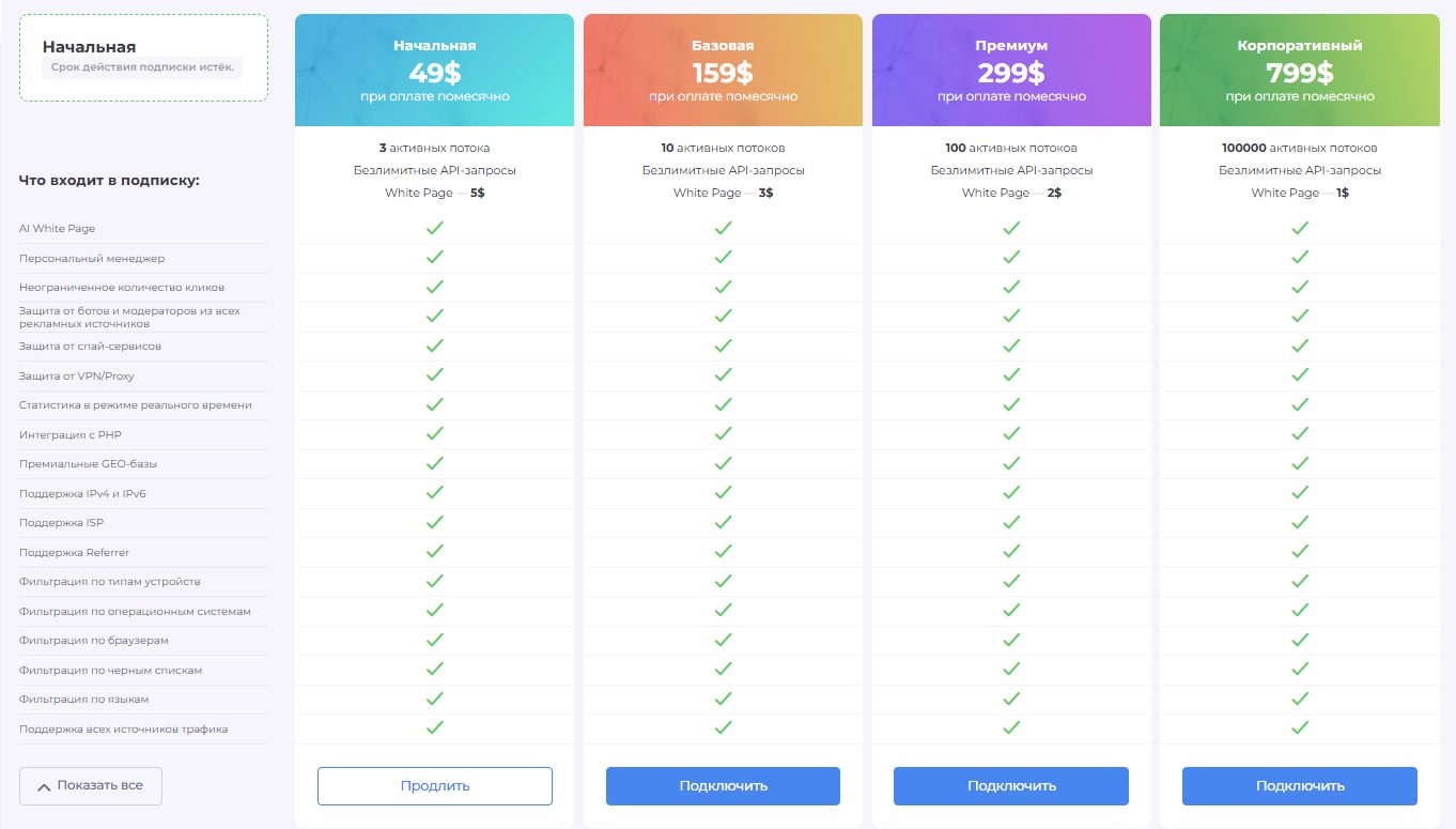 | Особенности | Полный функционал на всех тарифах, подробные фильтры, белые и черные списки, создание AI White Page, точная статистика с аналитикой по трафику, три варианта перенаправления – подгрузка, редирект, iFrame. |