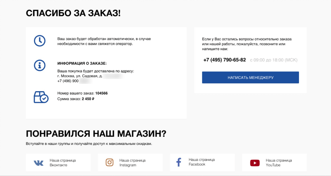 Если говорить в целом и общем, то страница благодарности нужна, чтобы создать у пользователя чувство завершенности. И добавить ощущение того, что его заказ попал в обработку, скоро будет доставлен, а значит, клиент может быть спокоен. Однако помимо этого у страницы есть еще несколько важных задач.