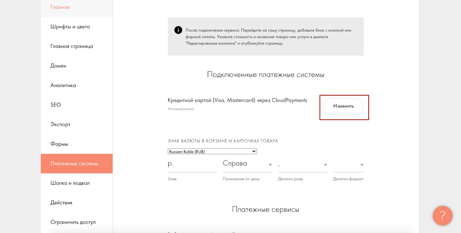 В первом случае переходим в раздел «Платежные системы», жмем на кнопку «Изменить» и вписываем URL успеха и неудачи.