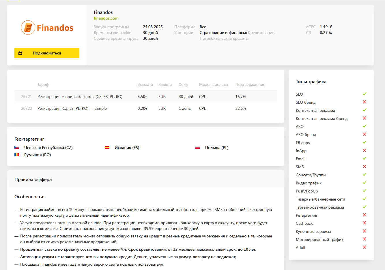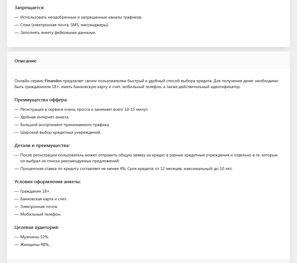 Сам продукт — агрегатор, который помогает оформить кредит. Рекл платит отдельно за регистрацию и привязку карты. В карточке можно увидеть доступные ГЕО и источники, запреты, подробное описание продукта, требования к трафику и ЦА.