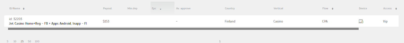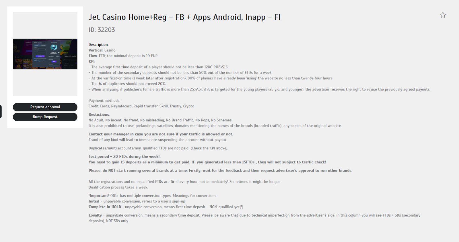 На скрине видим название — Jet Casino, целевую страну и разрешенные источники: FB, Android Apps, In-App. Указан размер выплаты — $153 по CPA, и тип доступа. Перейдя в карточку, можно увидеть более подробную инфу.