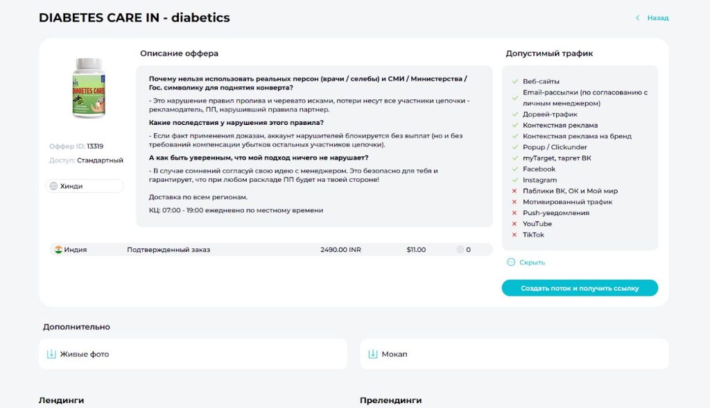 В карточке обычно пишут доступ, выплату и страну, правила залива и допустимые источники. KPI в нутре нет, потому что оплачиваются только подтвержденные заявки. Разве что могут быть требования к выкупу товара, но это узнается либо постфактум, если трафик откровенно плохой, либо по запросу у личного менеджера.
