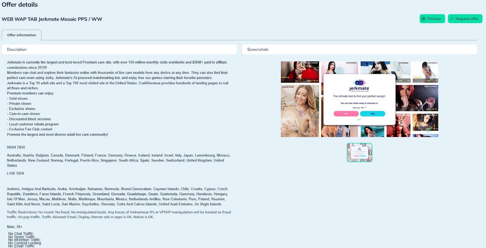 К адалту часто относят нутру категории 18+, то есть всякие БАДы для потенции, от простатита, кремы для увеличения члена и т.д. Но это все еще нутра. Я же приведу пример, который относится исключительно к адалту, — вебкам-платформа.