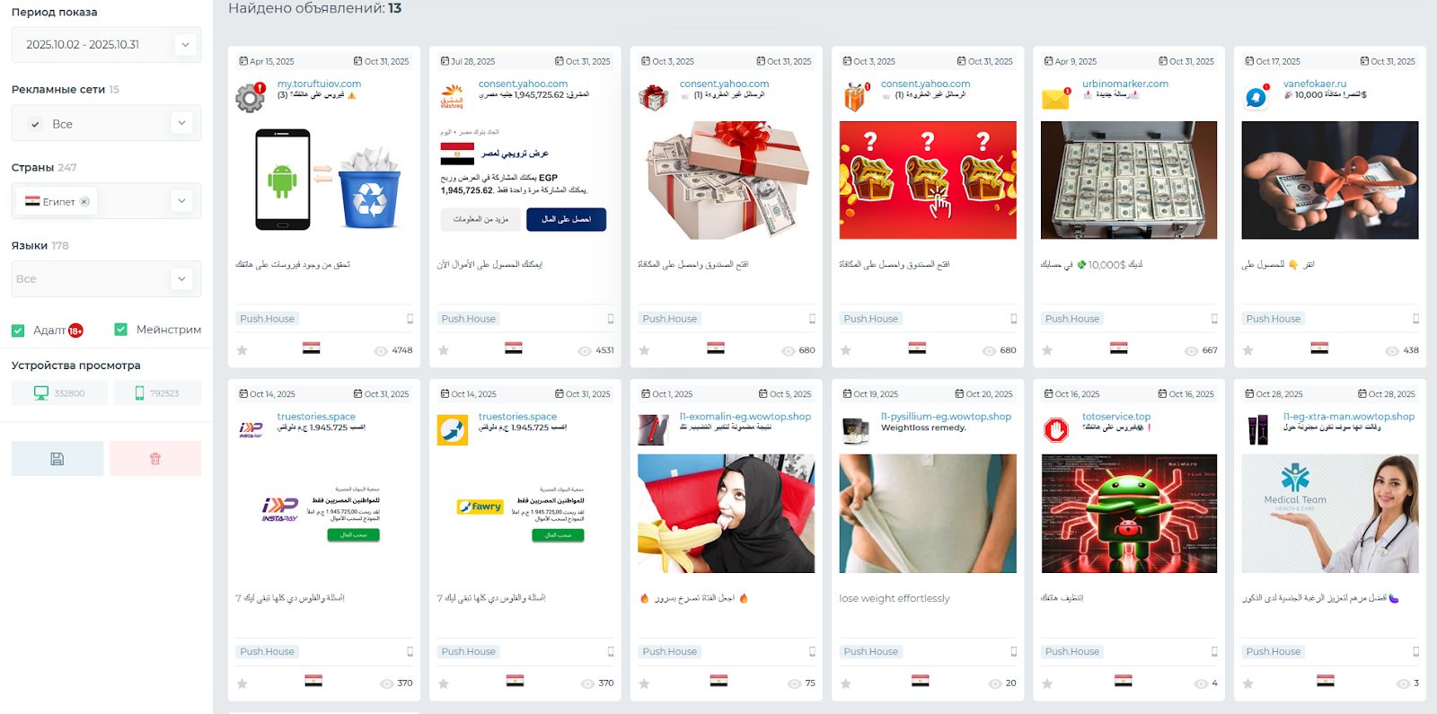 Допустим, я хочу лить этот крем с Push.House. Заходим в спай, выбираем нужную сетку и период отображения. Я выбрал за последние 30 дней, мобильный тип трафика не фильтровал, тут и так только он.