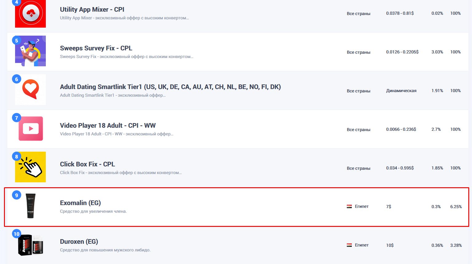 Например возьмем оффер из топ 10 в одной из партнерок — Exomalin.