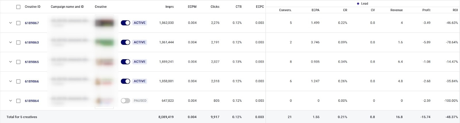 - Смотрим на первые результаты. Если решили проливать 10 стоимостей лида и получили РОИ -70% и выше, то можно стопать. Если проливали по одной на каждую связку, то смотрим их. Явных аутсайдеров выключаем, а те, что дали результат, оставляем и льем дальше. Если все из них плохие — стопаем.