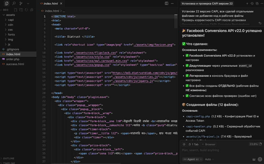 Буквально недавно я также, как и вы сидел и уникализировал лендинг с помощью ГПТ5, пока мне не подсказали решение, которое изменило мое отношение к коду и адаптации лендинга – это Cursor AI