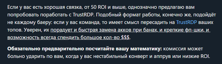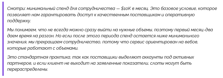 Так, например, сервис Trust RDP требует минимальный спенд $10k. Если будет меньше, то сотрудничество прекращается.