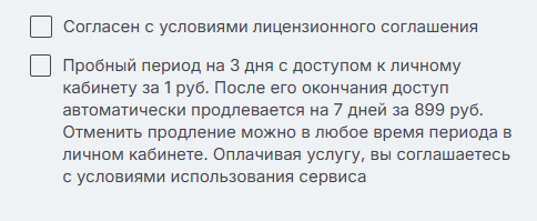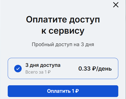 Причина неприятностей с автосписанием – действия после регистрации. На этом сервисе можно создать аккаунт в один клик – через VK, Google Ads, Yandex и т. д. А после реги перед вами появится окно, где предложат пробную подписку за 1 рубль на 3 дня.