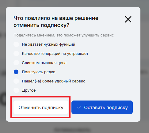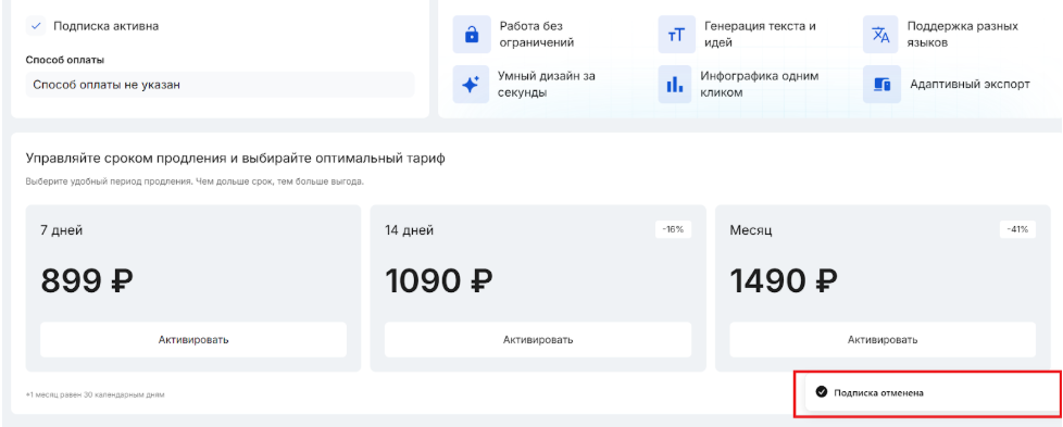 Нажмите ее. Если все сделано правильно, в правом нижнем углу появится уведомление «Подписка отменена». И Slidy AI перестанет списывать деньги просто так, за воздух.