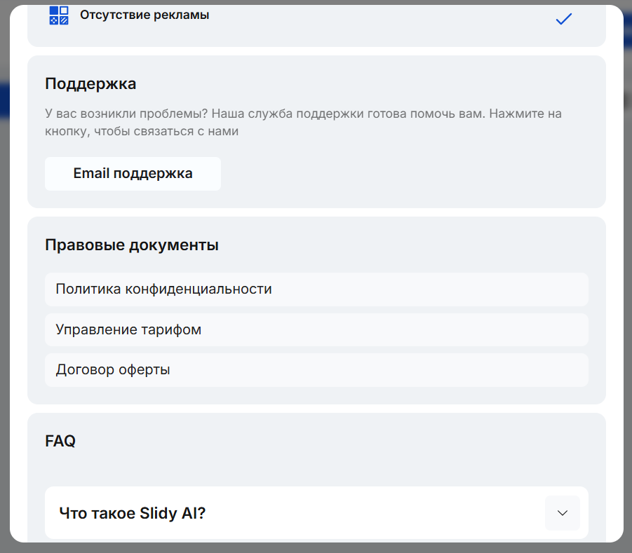 Есть призрачный шанс вернуть деньги обратно, если Slidy AI лагает, функции не соответствуют заявленным и т. д. В таком случае можно и нужно писать в саппорт. По закону средства обязаны возвратить в полном объеме, если у вас собраны все доказательства.