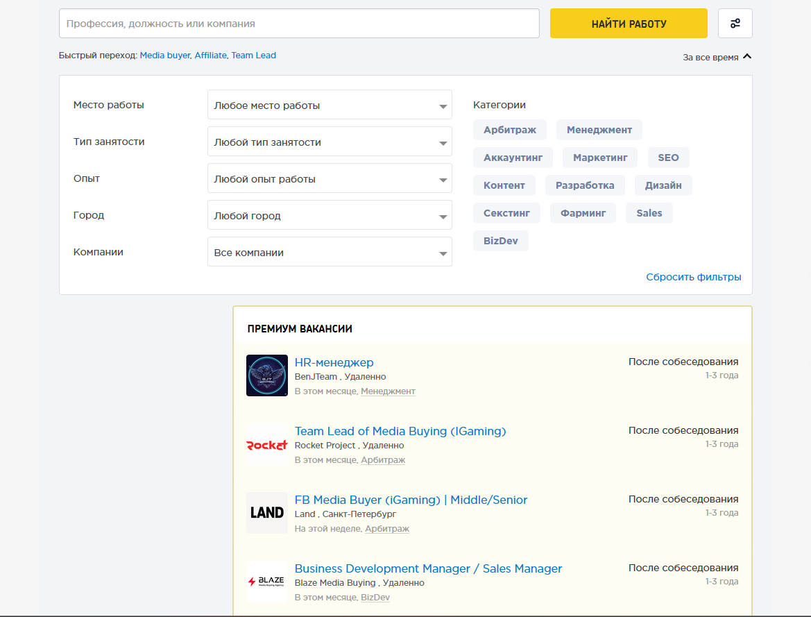 HeadHunter и подобные сайты на первом месте. Это база. Хоть арбитражники и работают в сером сегменте, они все равно заводят здесь резюме, если хотят примкнуть к кому-то. И я так тоже делала в свое время, когда хотела в баинг к ПП. На Хедхантере и описания шире, и можно создать резюме и откликаться по всем вакансиям, что найдешь.