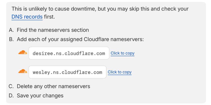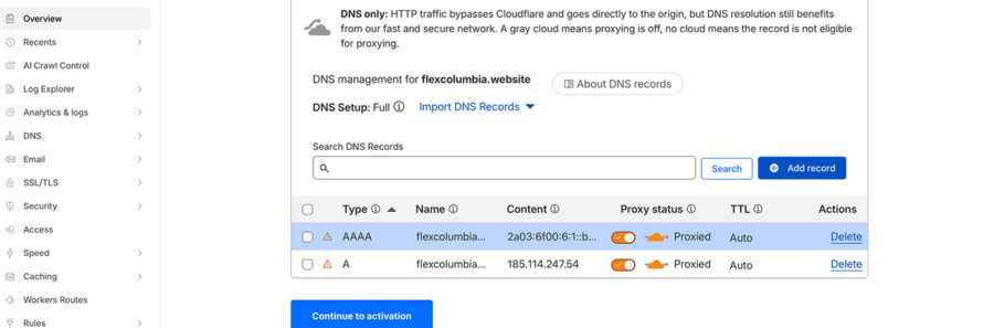 Не забудьте сменить NS адреса в вашем регистраторе на NS адреса CF.