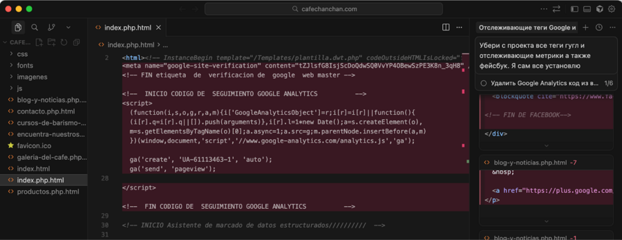 - «Убери с проекта все теги гугл и отслеживающие метрики а также фейсбук»