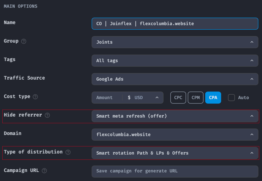 - HIDE REFERRER: Нужен для того, чтобы ПП не могла отследить, с какого лендинга пришел пользователь – выбираем Smart rotation Path & LPs & Offers