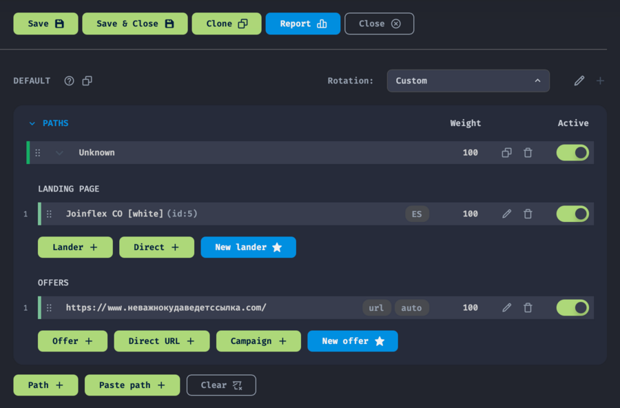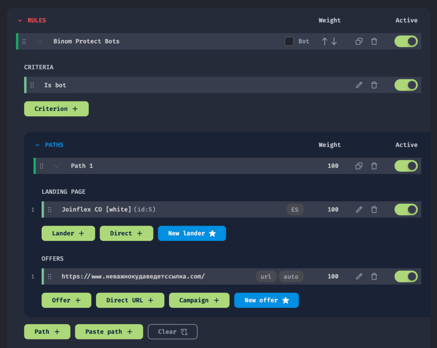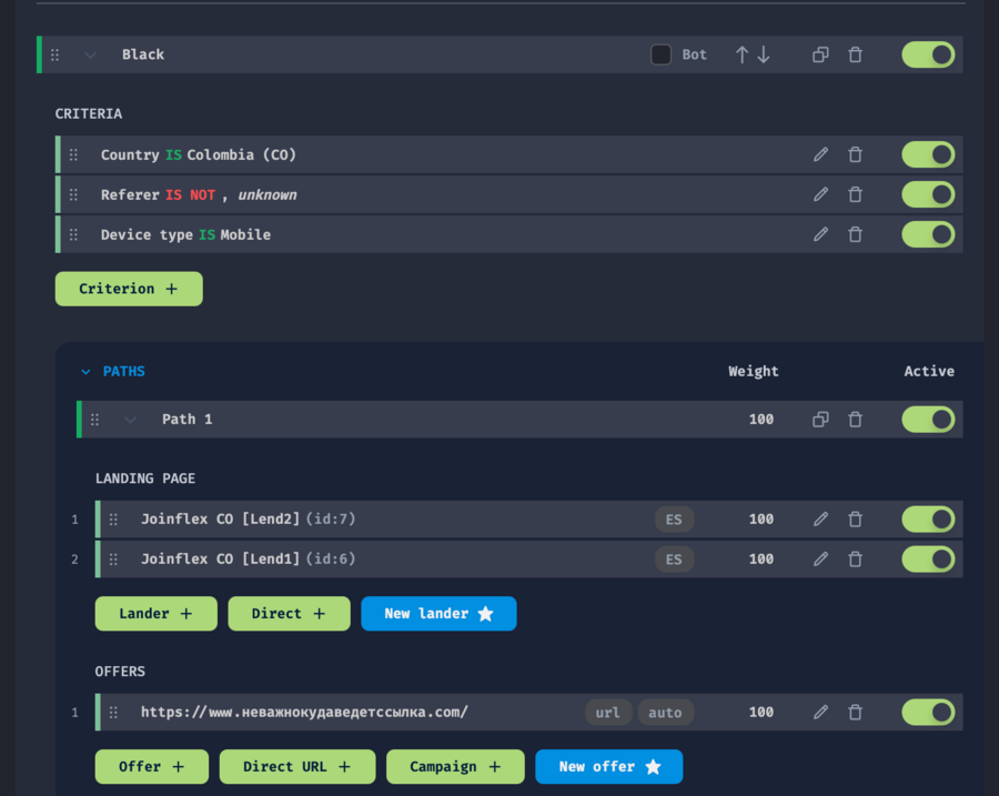 В этом разделе мы с помощью потоков разделяем ботов и модераторов источника от реальных пользователей, которые пришли за нашим продуктом. Именно правильная настройка Campaign определяет, как будет обрабатываться трафик и насколько эффективно будет работать весь залив в целом.