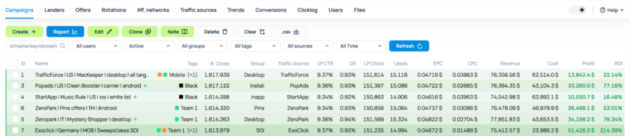 - Группы, теги, источники. Поиск по имени, домену и ключу. Нужные кампании всегда под рукой – В общем простота управления кампаниями;